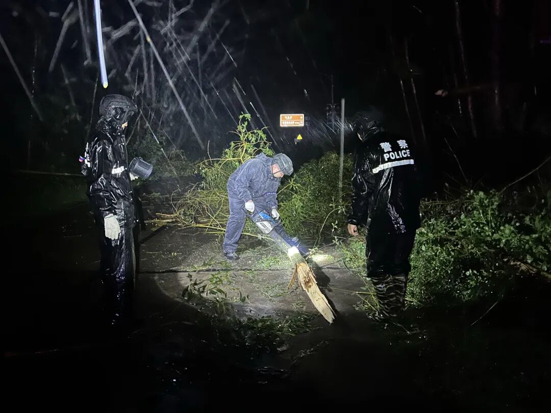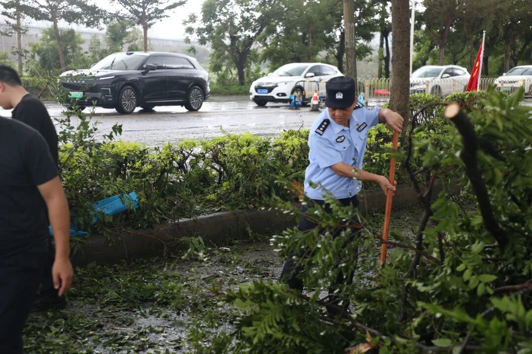 林林副縣長帶隊青年民警突擊隊、機動訓練大隊和交管大隊等應急力量,趕赴G207、G228等主干道,扶起狂風吹倒的中間防護欄,鋸砍斷并移開倒在路間的樹木,支起倒下的廣告牌,在積水深路段樹立警示牌,筑起守護人民生命財產安全防線。
