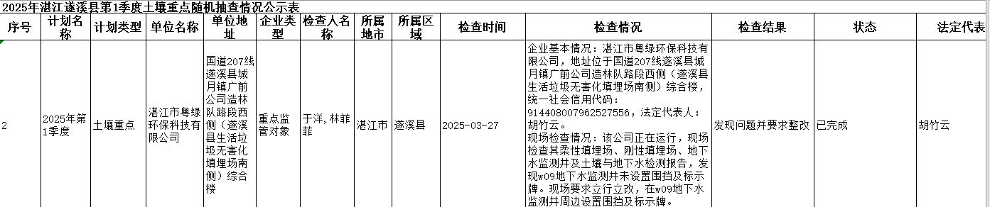 2025年湛江遂溪縣第1季度土壤重點隨機抽查情況公示表