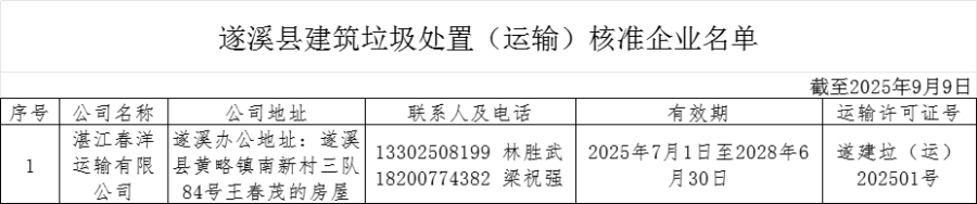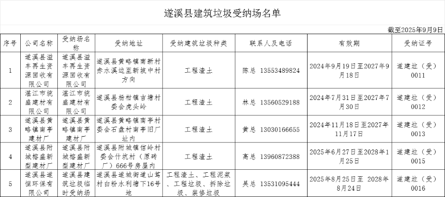 遂溪縣建筑垃圾運(yùn)輸企業(yè)名單和建筑垃圾受納場名單