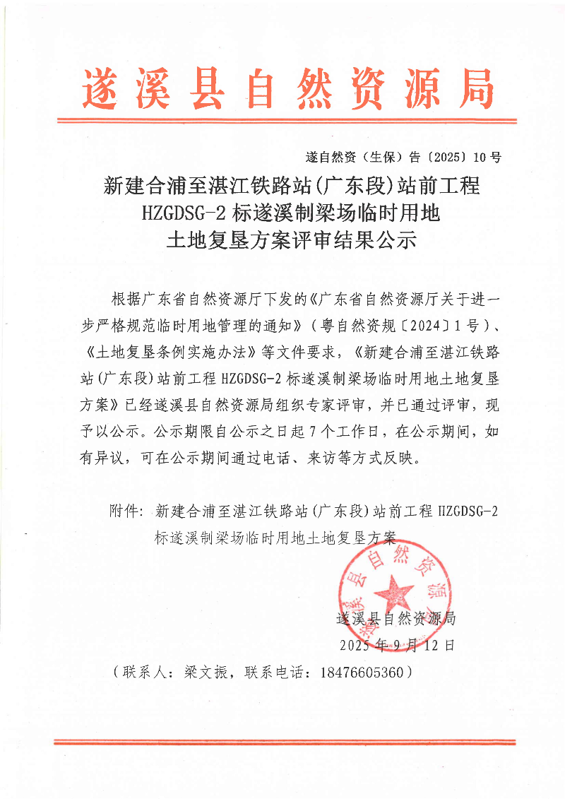 新建合浦至湛江鐵路站(廣東段)站前工程HZGDSG-2標遂溪制梁場臨時用地土地復(fù)墾方案評審結(jié)果公示