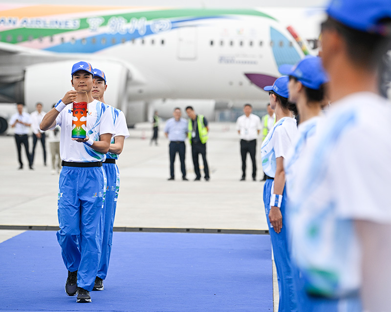 當(dāng)日,第31屆世界大學(xué)生夏季運(yùn)動會火炬?zhèn)鬟f啟航儀式在成都天府國際機(jī)場舉行。在護(hù)衛(wèi)隊(duì)的守護(hù)下,成都大運(yùn)會火種順利登機(jī)。隨后,搭載著成都大運(yùn)會火種的“大運(yùn)號”飛機(jī)啟程前往北京。