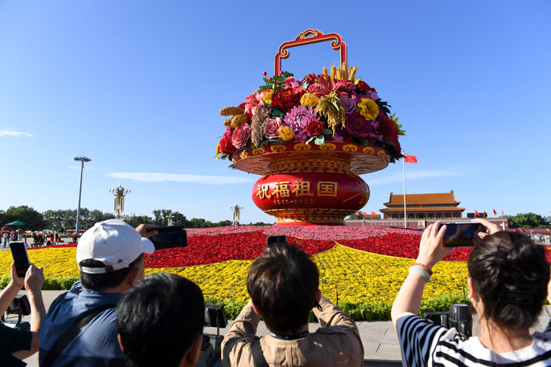 中秋及國慶節假期臨近,北京天安門廣場上的“祝福祖國”巨型花籃吸引著眾多市民游客參觀游覽。
