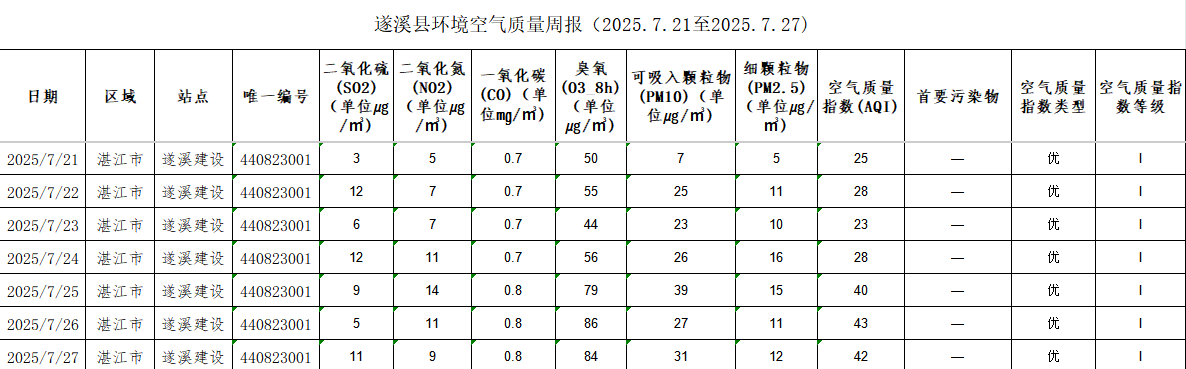 遂溪縣環境空氣質量周報(2025.7.21至2025.7.27)
