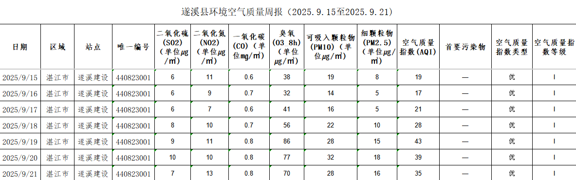 遂溪縣環(huán)境空氣質(zhì)量周報(bào)(2025.9.15至2025.9.21)