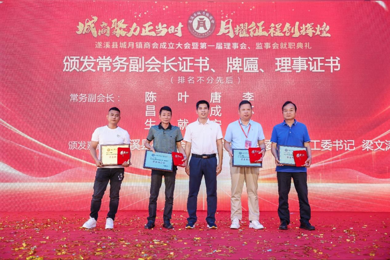 縣委常委、統戰部部長朱凌靜、城月鎮黨委書記王武慶、城月鎮商會會長鄧發春、城月鎮商會名譽會長陳樹偉共同為商會揭牌。