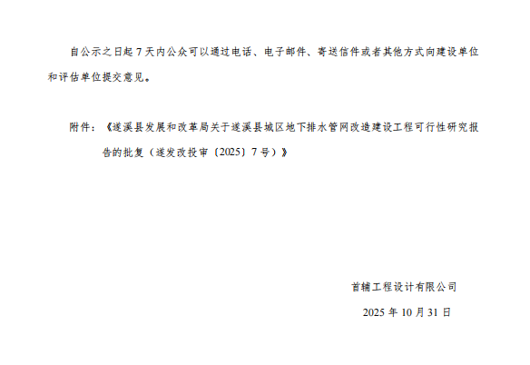 遂溪縣城區地下排水管網改造建設工程社會穩定風險評估公眾參與公示 | | 作者: | 來源:本網 | 時間:2025-10-31 17:48:48 點擊數:- 附件:遂溪縣發展和改革局關于遂溪縣城區地下排水管網改造建設工程可行性研究報告的批復.pdf 【打印正文】